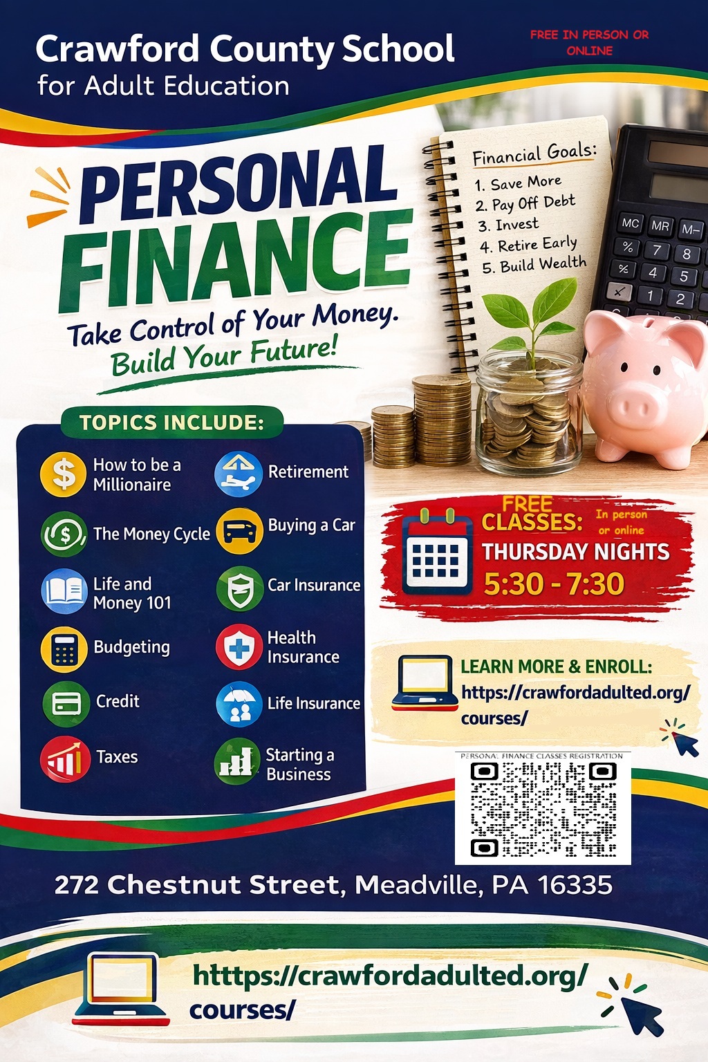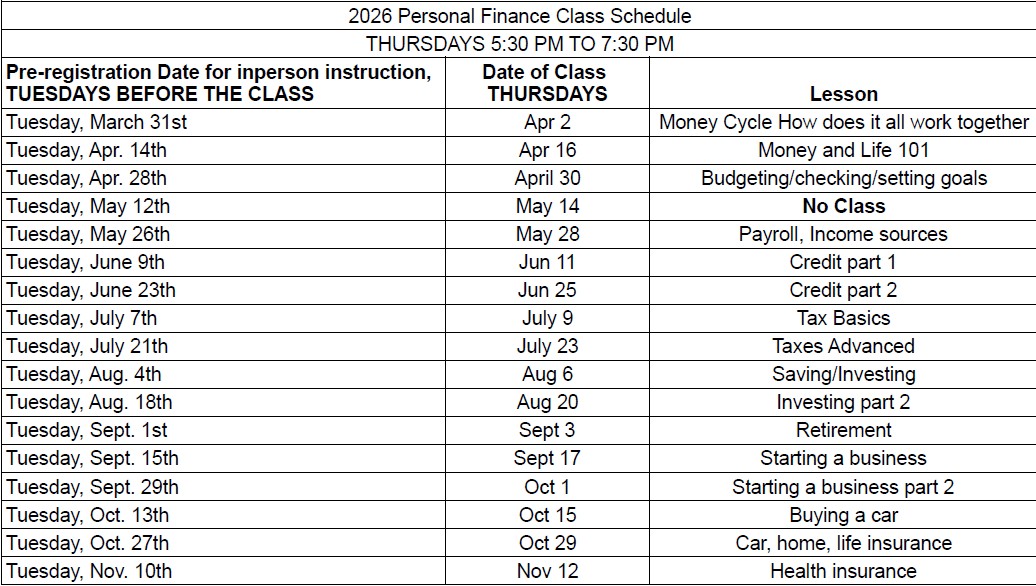Classes are held every other Thursday from 5:30 pm to 7:30 pm, online or in-person. Gary Glunt will be teaching most of the classes. When he is not, he will bring in industry leaders. Gary has a degree in accounting/business administration, has taught personal finance for 29 years and has owned 4 businesses.